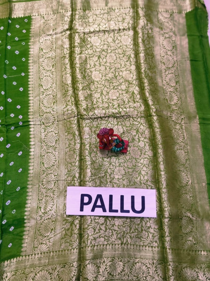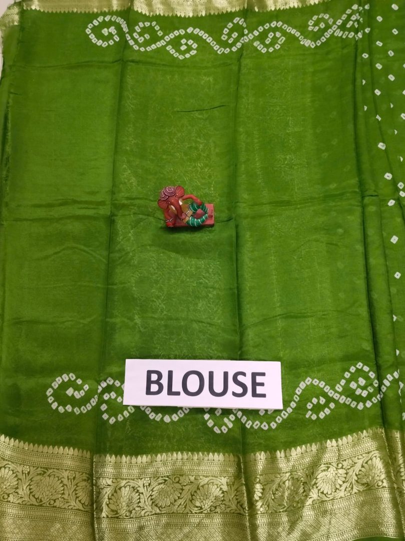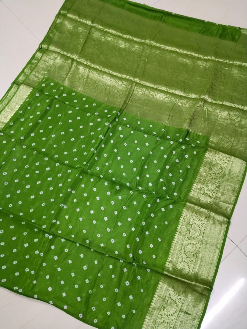 Design: Bandhani Print all over the Saree with Golden Zari Border and Pallu.