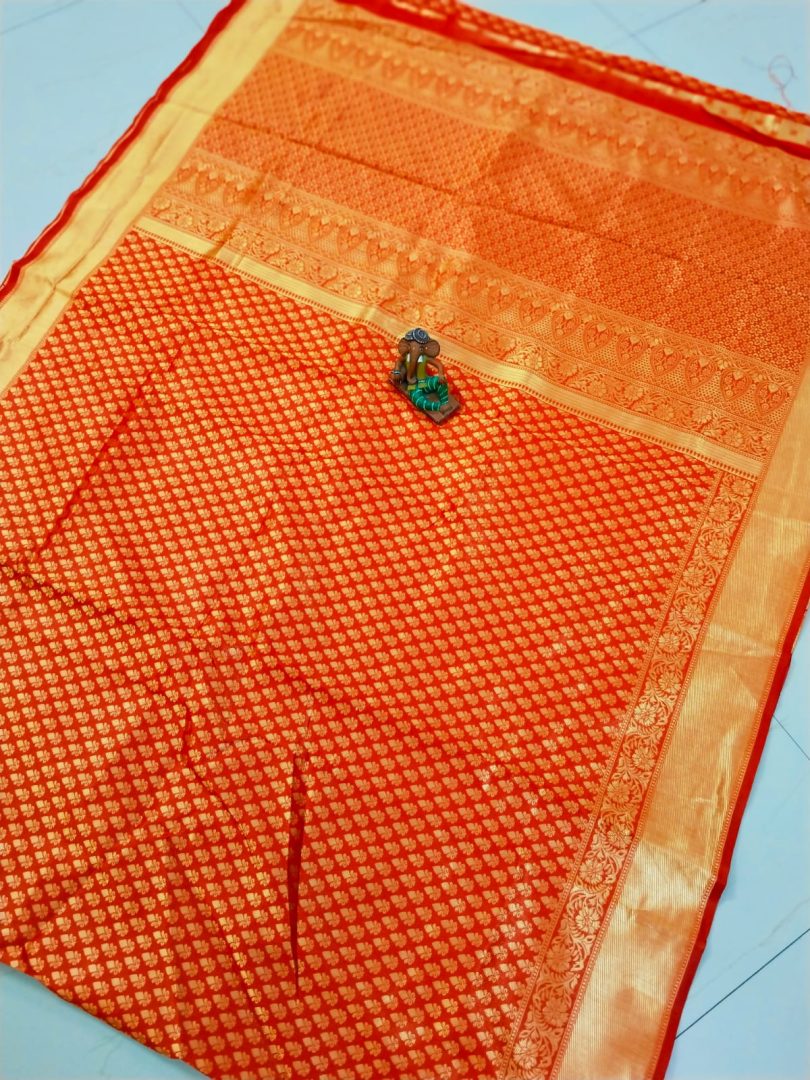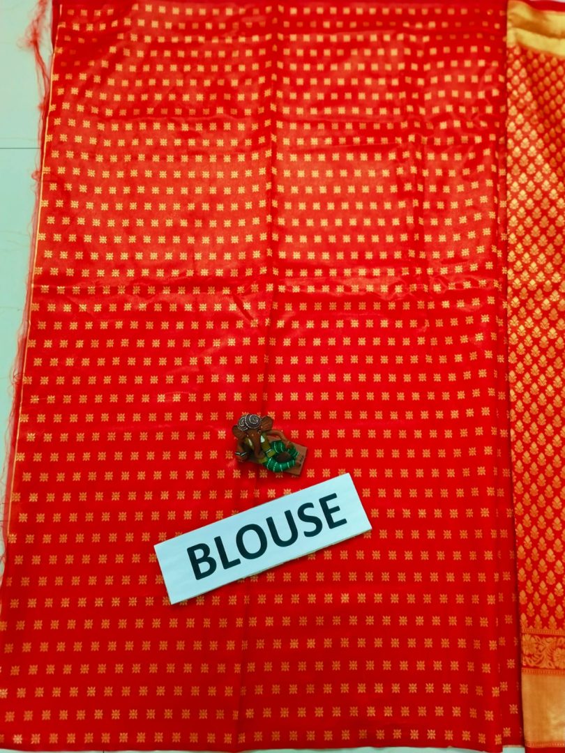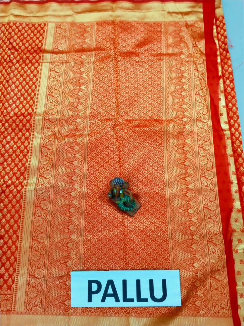 Color : Red colour Saree and Blouse with Golden Zari Border.