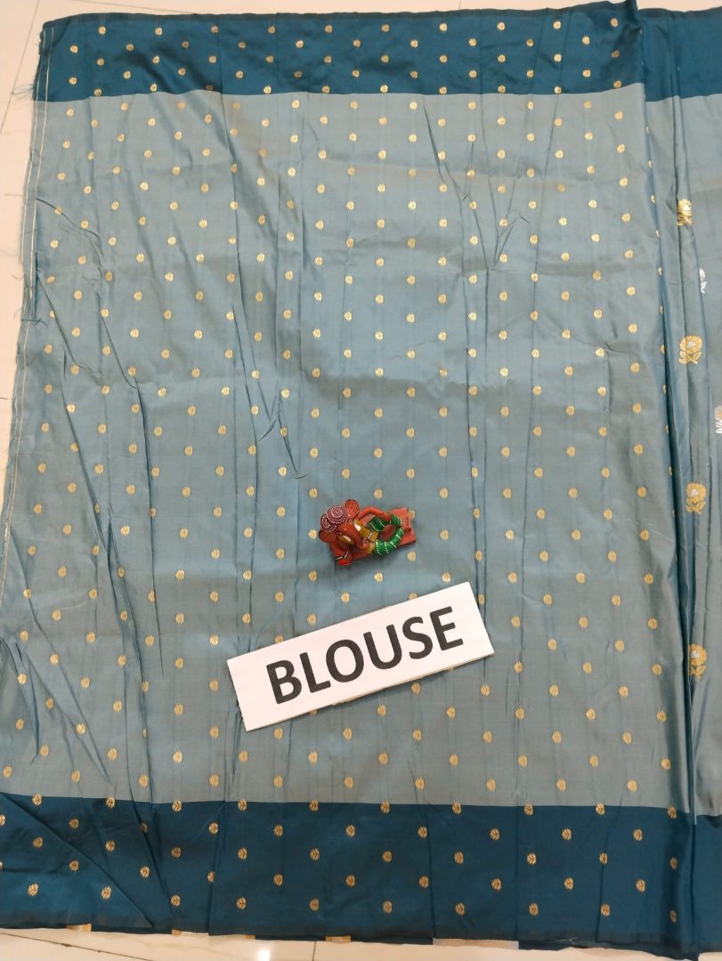 Color : Dusty Blue Saree and Blouse with Golden Zari Border.