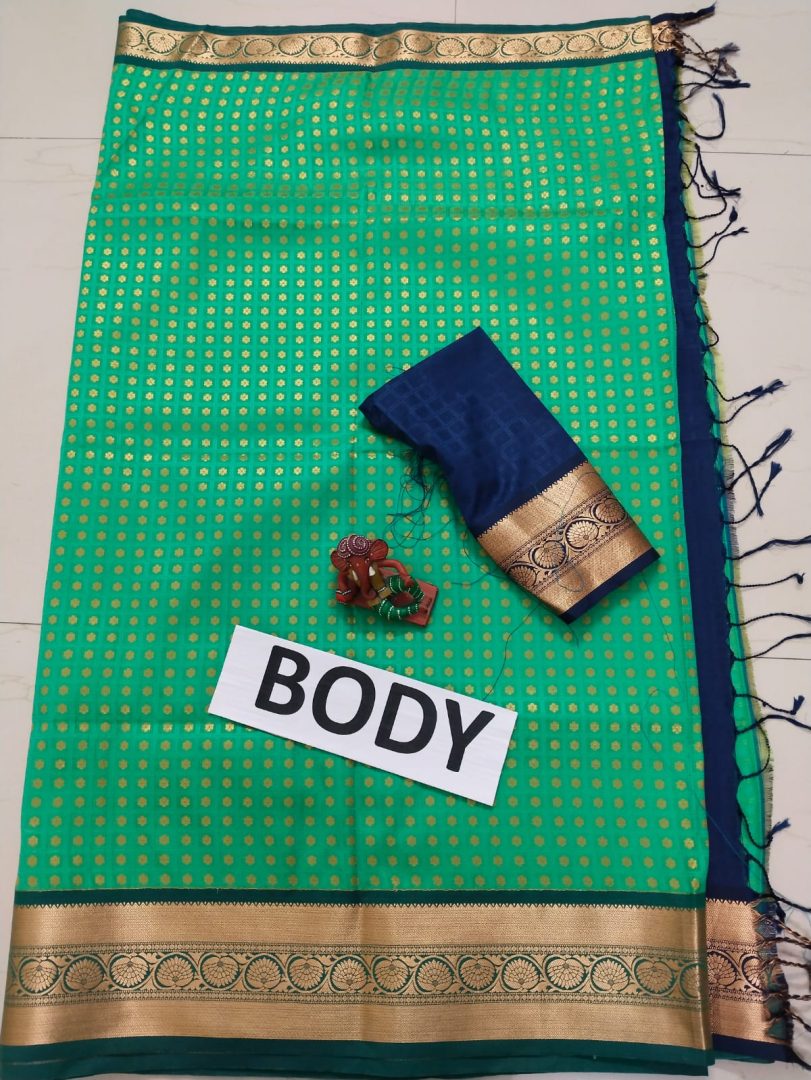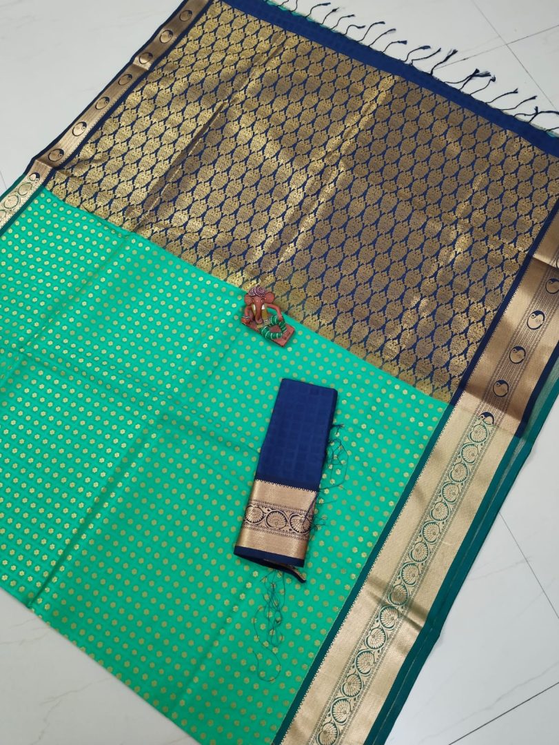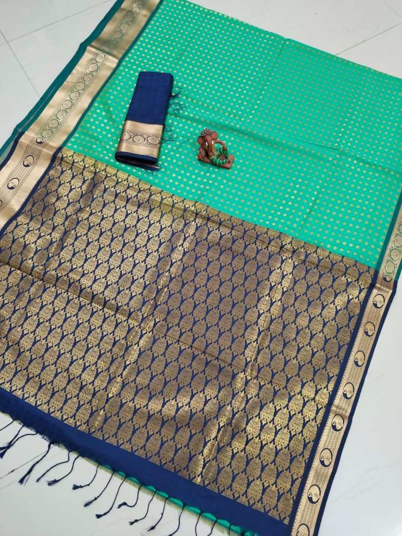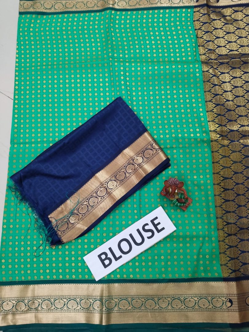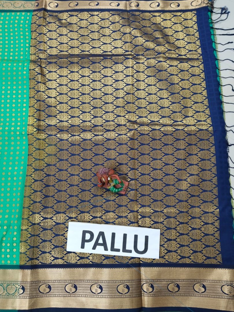 Color : Sea Green Saree and Navy Blue Plain Blouse with Golden Zari Border.
