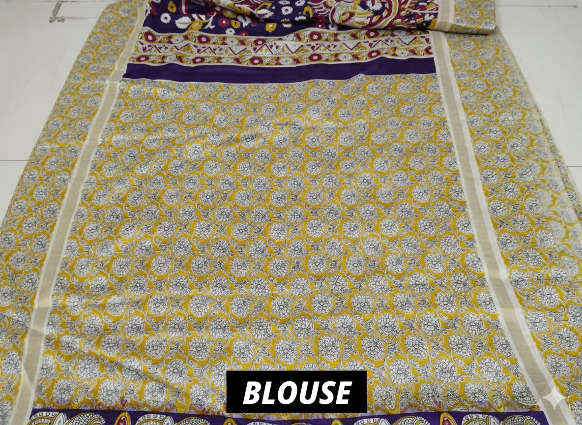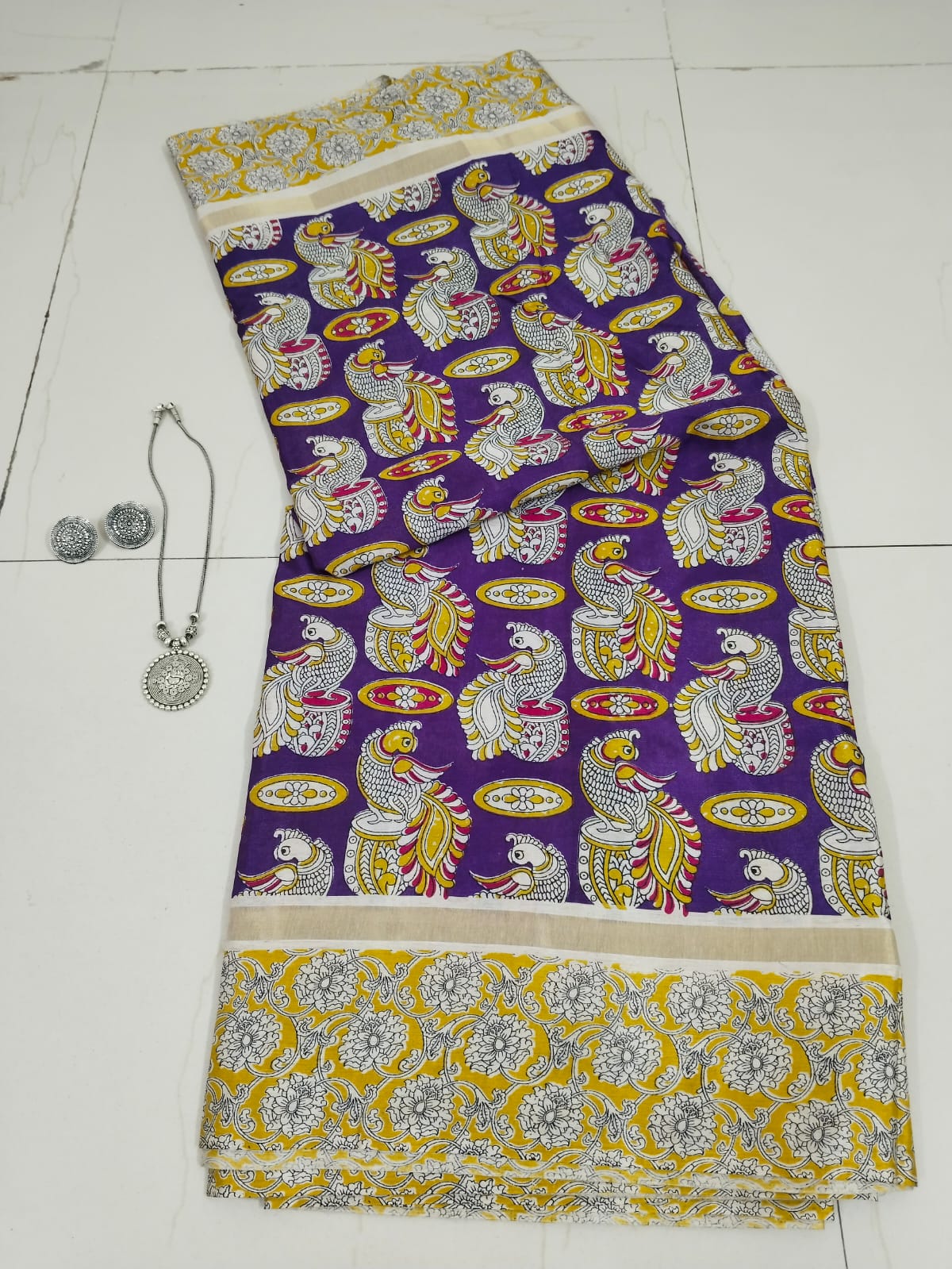 The term “Kalamkari” means “pen craft,”. Kalamkari sarees are made of Pure Cotton OR silk. These sarees are light weight and breathable. These sarees feature intricate hand painting with classic designs such as flowers, peacocks and other traditional Indian designs.