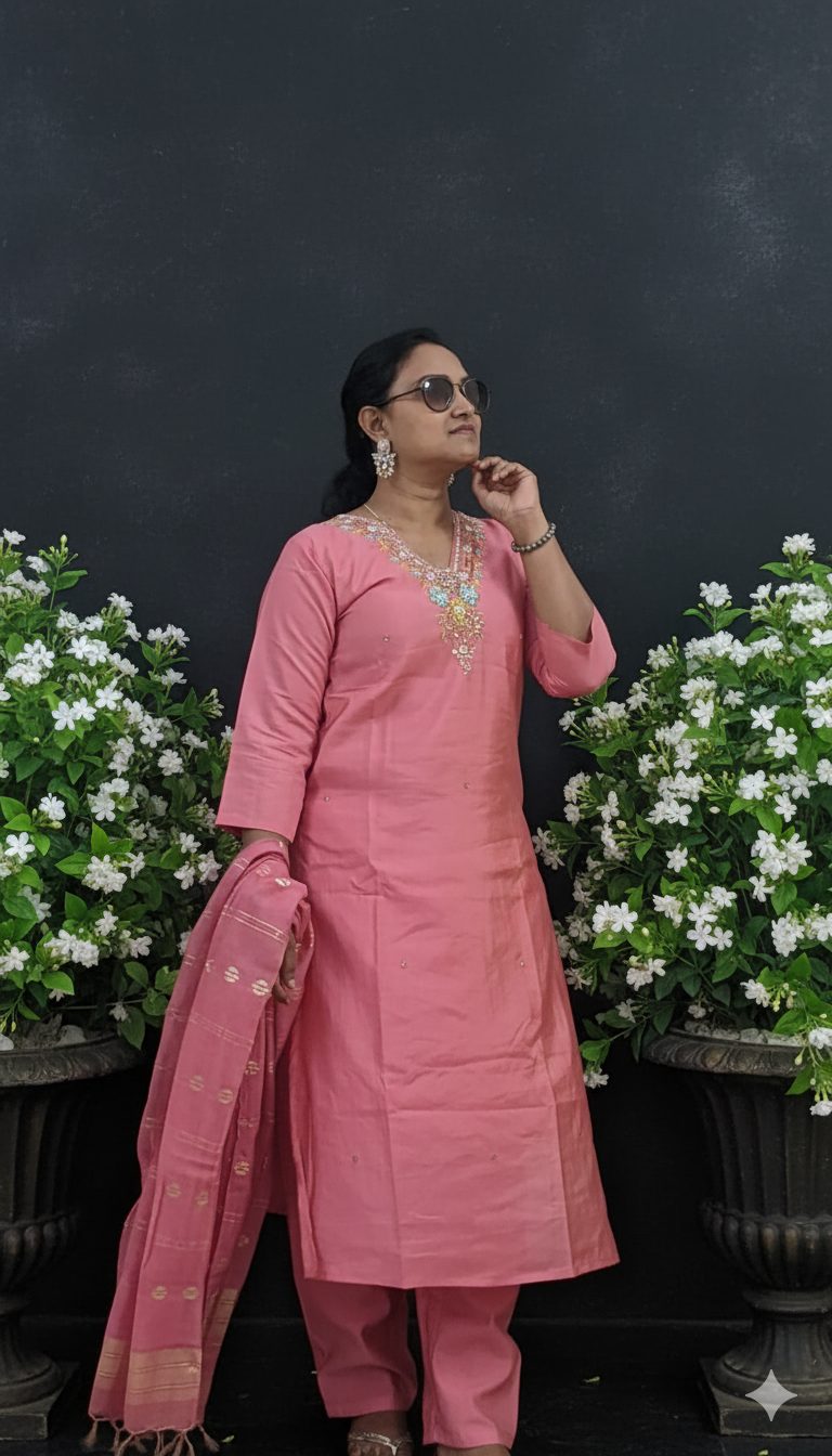 A kurta set typically consists of a kurta (long tunic), paired with either a salwar, churidar, or palazzo, and accompanied by a dupatta. The kurta often features intricate embroidery, prints, or subtle patterns, and can be made from a variety of fabrics like cotton, silk, or linen.