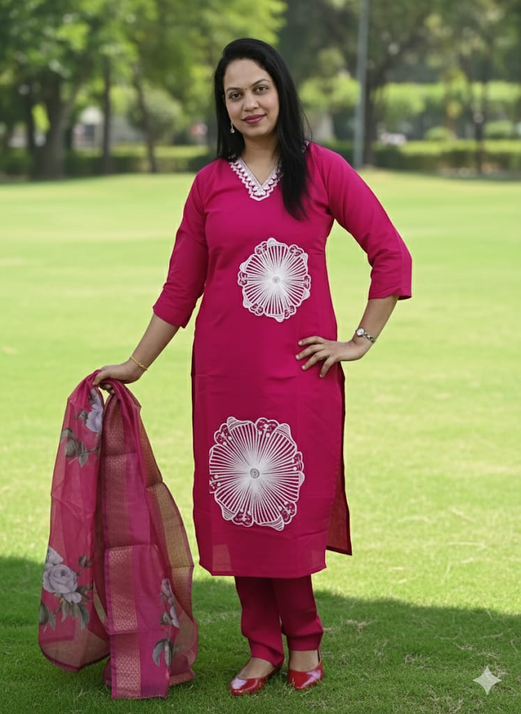A kurta set typically consists of a kurta (long tunic), paired with either a salwar, churidar, or palazzo, and accompanied by a dupatta. The kurta often features intricate embroidery, prints, or subtle patterns, and can be made from a variety of fabrics like cotton, silk, or linen.