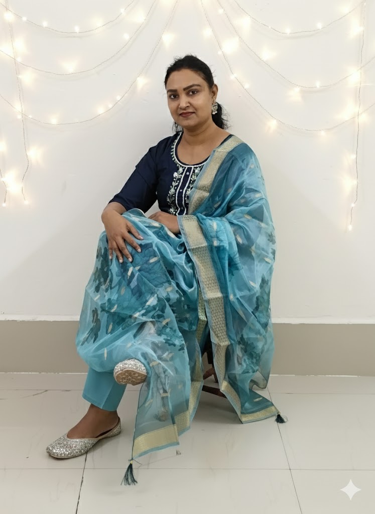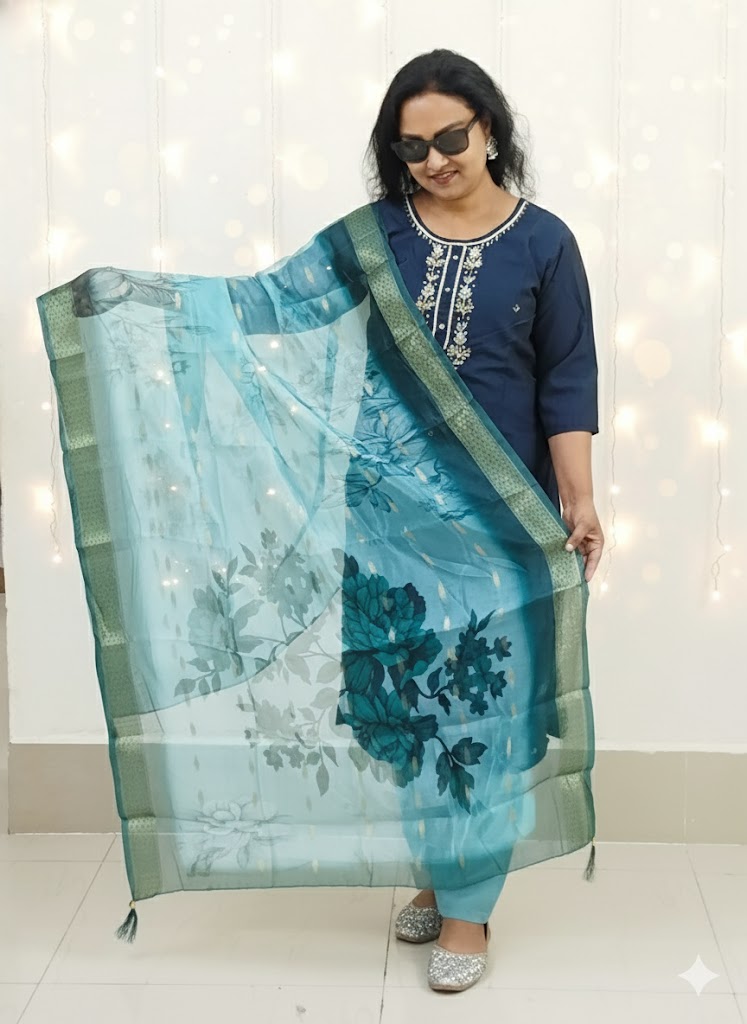 A kurta set typically consists of a kurta (long tunic), paired with either a salwar, churidar, or palazzo, and accompanied by a dupatta. The kurta often features intricate embroidery, prints, or subtle patterns, and can be made from a variety of fabrics like cotton, silk, or linen.