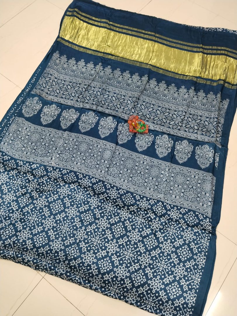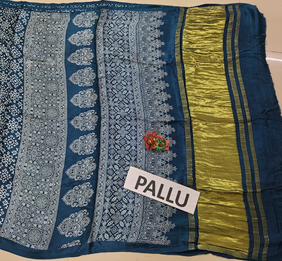 Premium Modal Silk Sarees are a type of sarees made from Modal Fabric, which is a blend of cotton and silk. They are known for being soft, breathable, and draping well. In India Modal silk sarees are made and famous in many places, especially Gujarat, Bhuj.