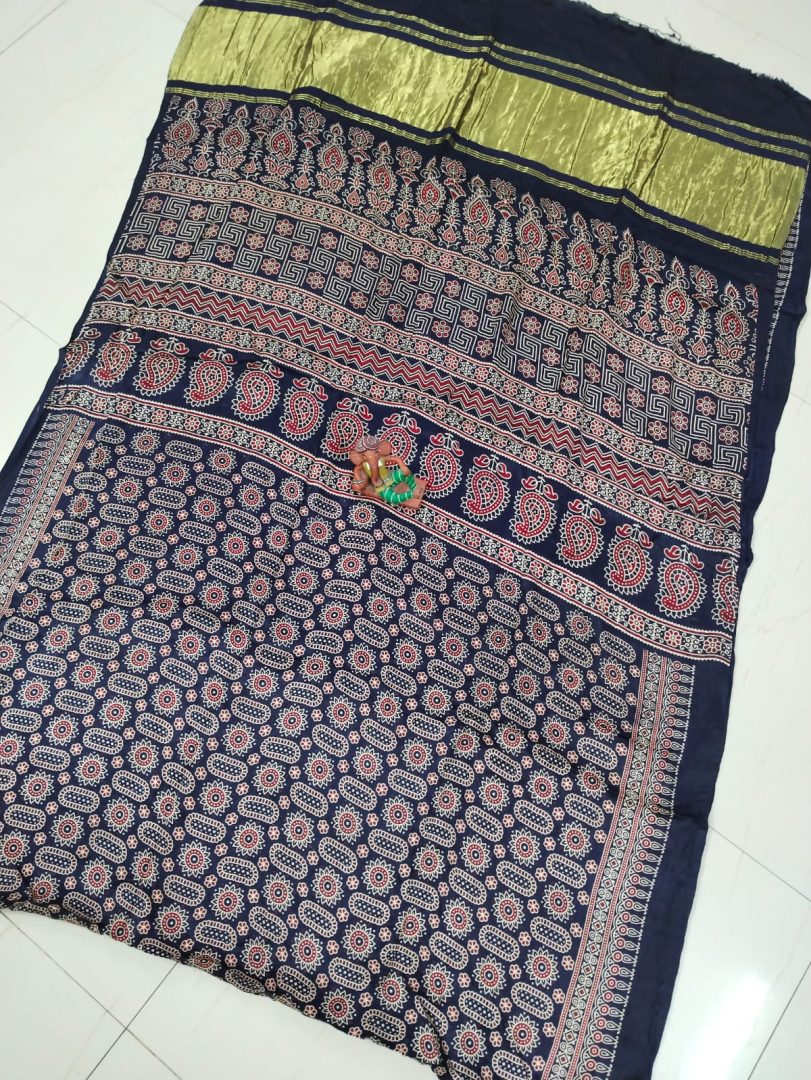 Premium Modal Silk Sarees are a type of sarees made from Modal Fabric, which is a blend of cotton and silk. They are known for being soft, breathable, and draping well. In India Modal silk sarees are made and famous in many places, especially Gujarat, Bhuj.