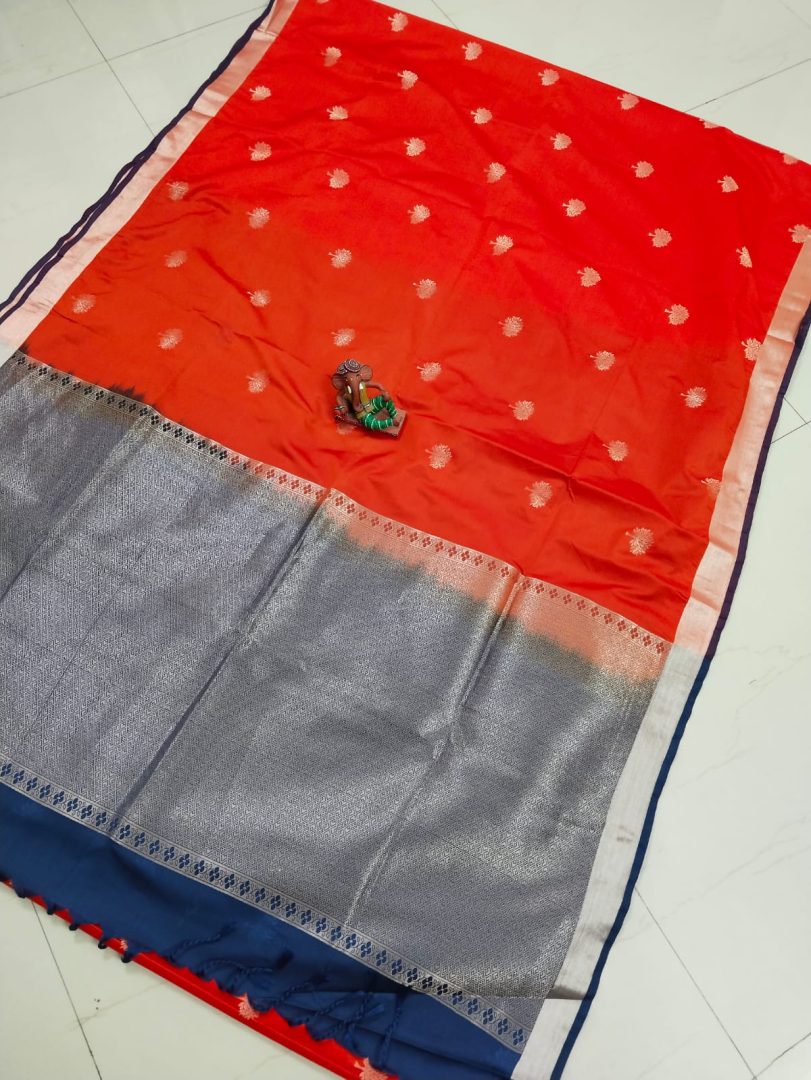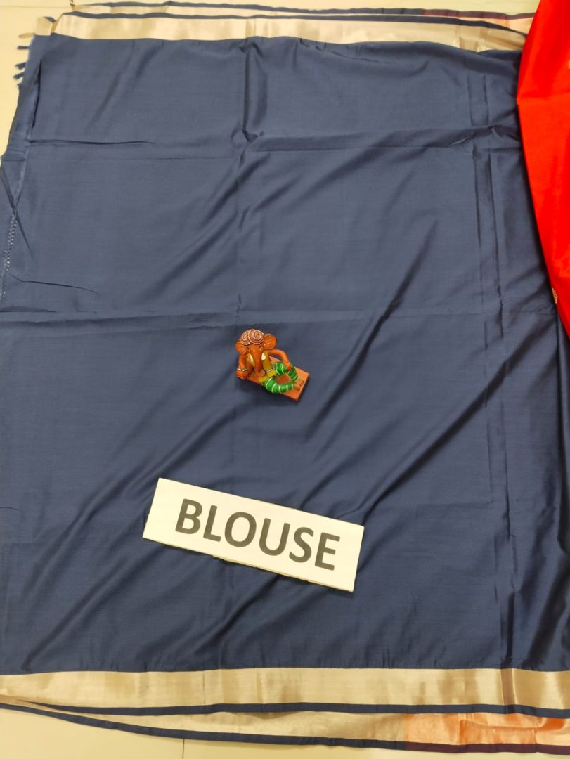 Color : Orange Saree with Navy Blue Plain Blouse and Copper Zari Border.