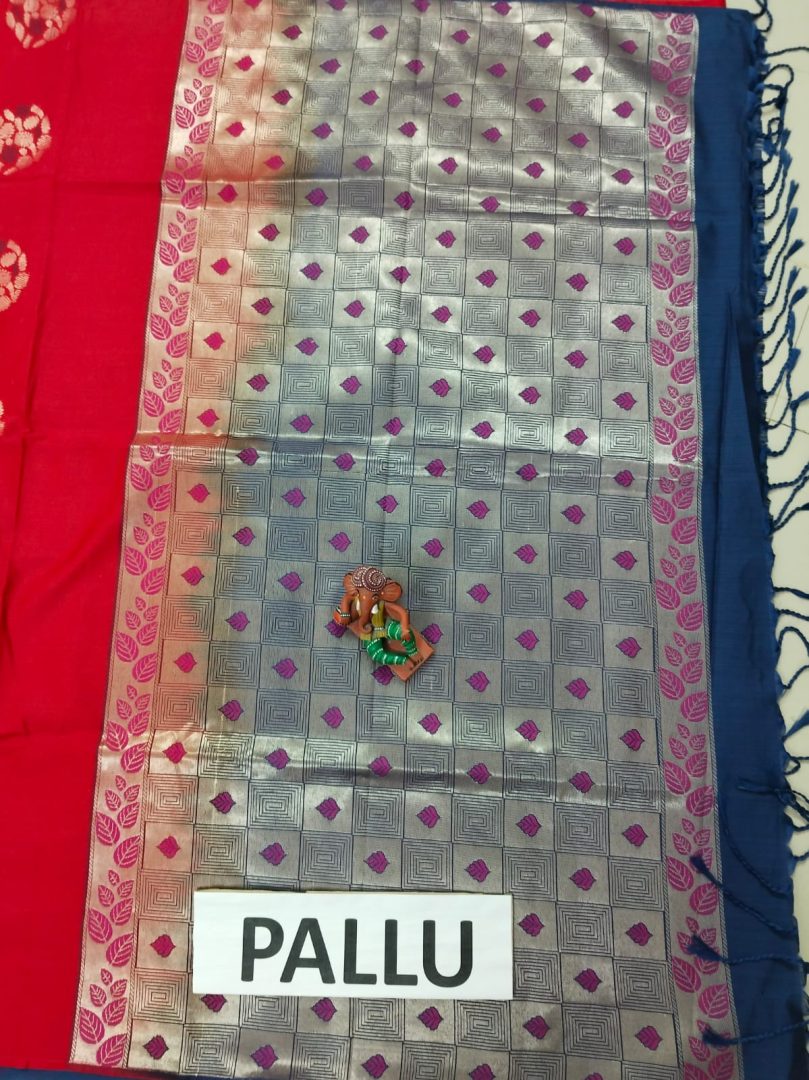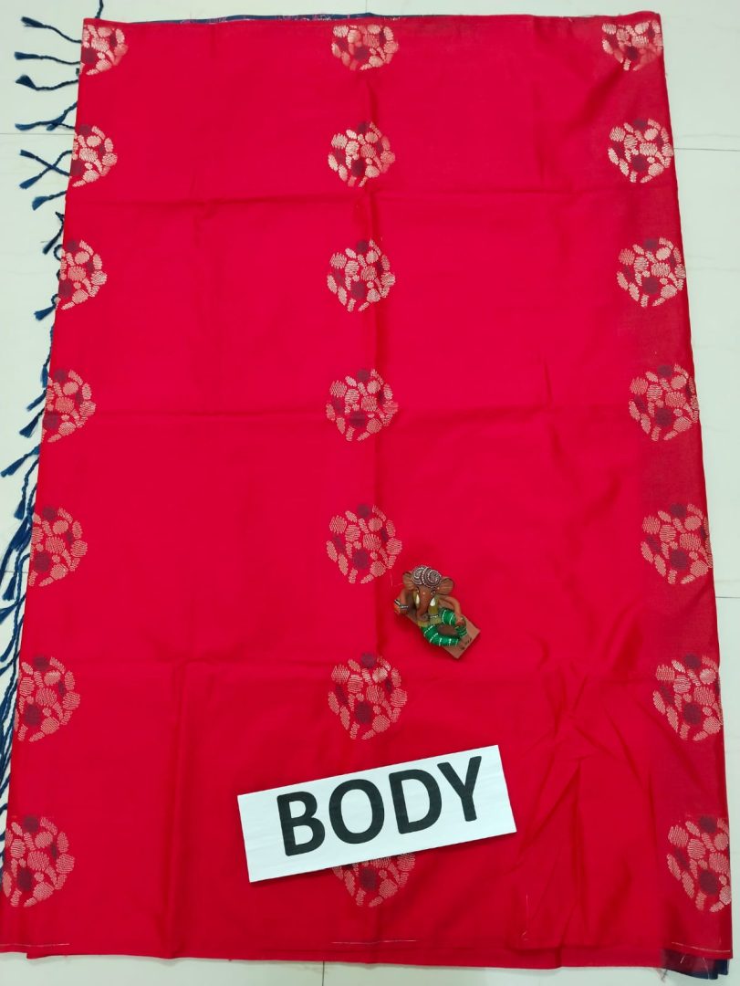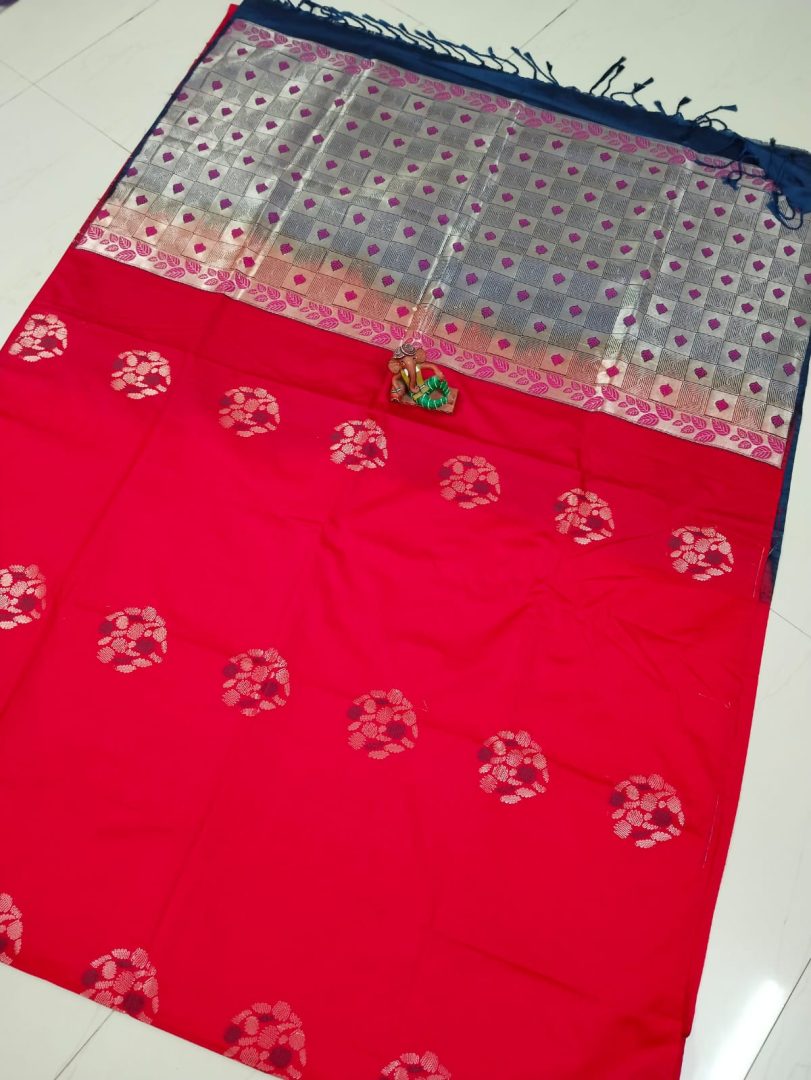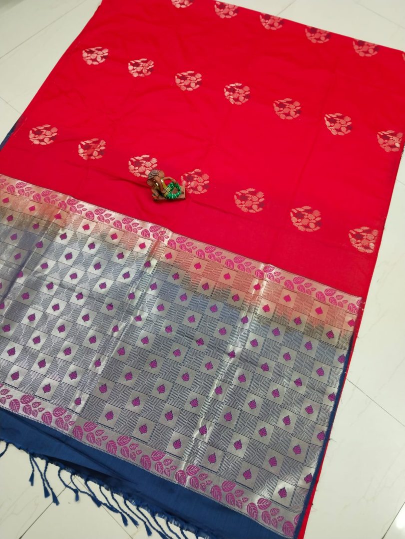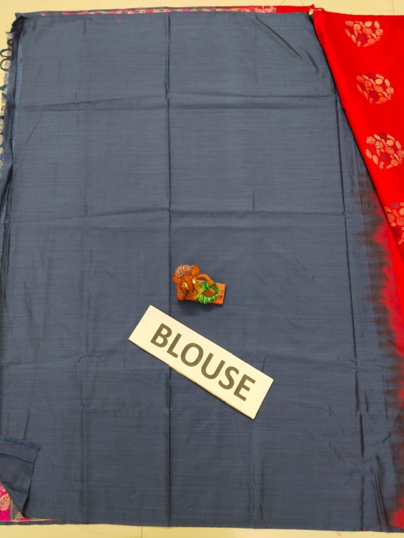 Color : Red Saree with Navy Blue Plain Blouse and Silver Zari Border.