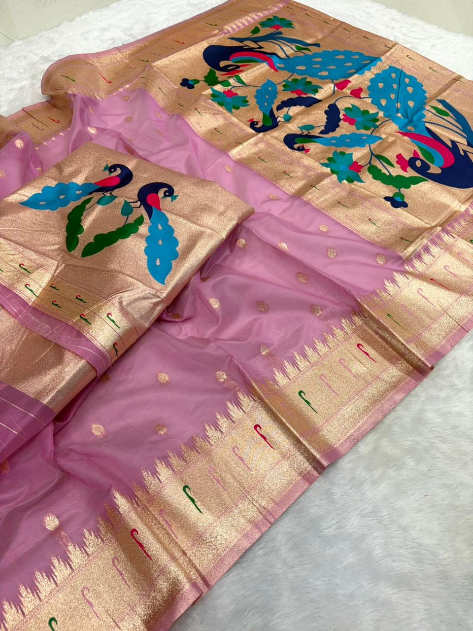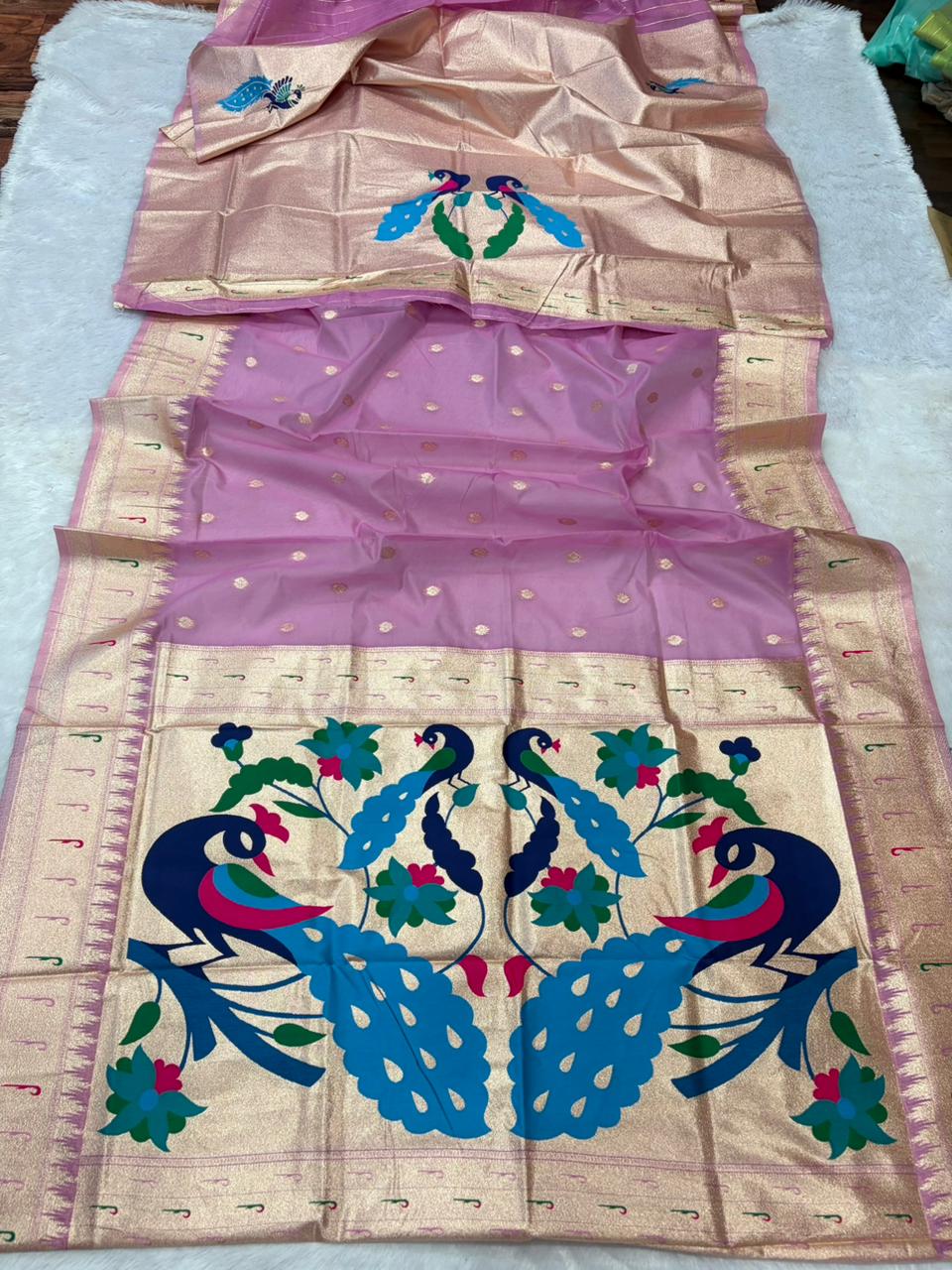 A perfect fusion of traditional design on trendy fabric making these sarees a must have in every wardrobe. They’re like the queens of sarees,  Originated in Maharashtra, these beauties are known for their rich, handwoven designs and vibrant colors. The intricate gold and silver thread work, peacock motifs, and floral patterns make ’em truly special.